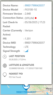 - When you click on a device name, a dashboard with details for only that device appears (see Device View Dashboard). Click Back at the top of the Menu to return to the Map dashboard.
