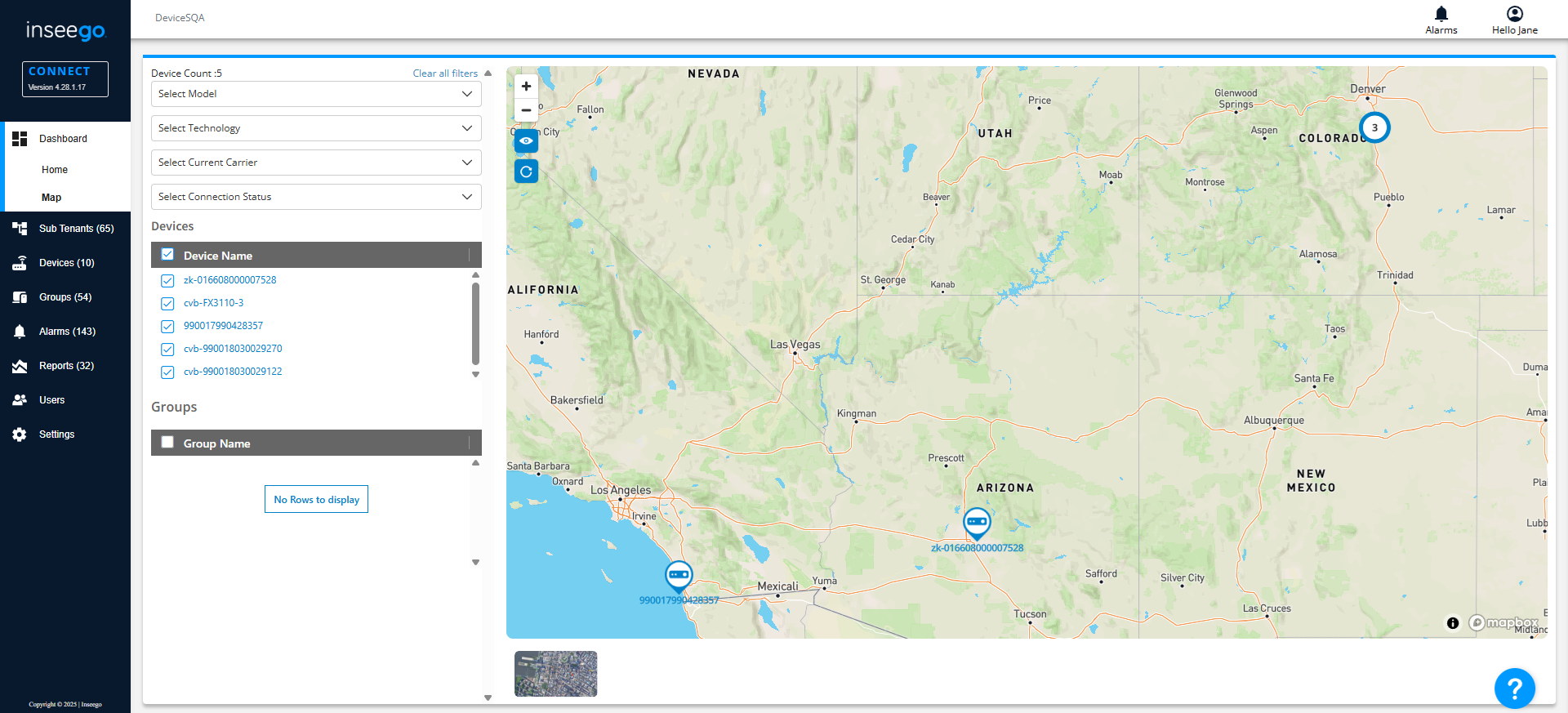 Lists all the devices currently registered with your Inseego Connect that have reported a GPS location. The last reported GPS location is shown on the map.